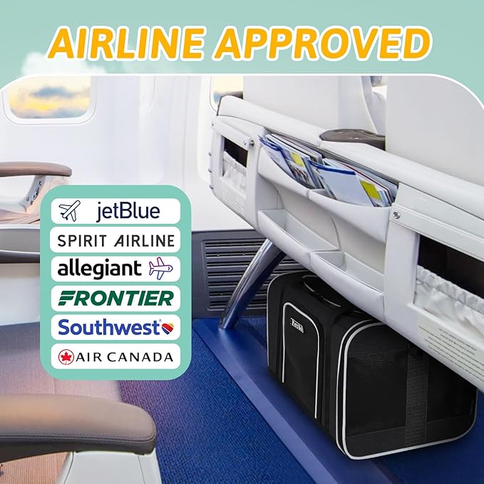 - 【AIRLINE APPROVED CARRIER 】Unfolded size:17"L×12"W×8.5"H, Petskd pet carrier is airline approved and can be placed under the seat in the cabin, it is mainly designed for ①JetBlue Airlines:17x12.5x8.5" ②Allegiant Airlines:19x16x9", but also in compliance with ③Southwest Airlines:18.5x13.5x9.5" ④Air Canada:21.5x15.5x10.5 ⑤Spirit Airlines:18x14x9". We recommend you buy this carrier when you fly with the above-mentioned airlines.