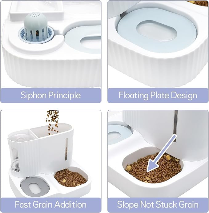 - Siphon Design : Automatic water dispenser for cats uses a siphon design, when the water in the tank reaches a certain height, the water will stop. The floating plate design of the water bowl can also prevent the pet's black chin