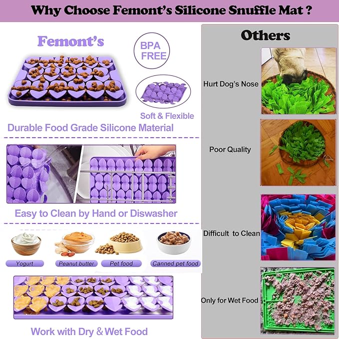 - What Will the Dog Sniffing Mat Bring to Your Pet? The Femont snuffle mat dog effectively reduces the speed of pet’s eating and prolong meal time,promote active and healthy feeding,effectively aid with digestion and bloating caused by eating too fast,also nicely consume their energy,reduces anxiety,relieve stress.Keep dogs occupied then avoid they being bored and engaged in destructive behavior at home.