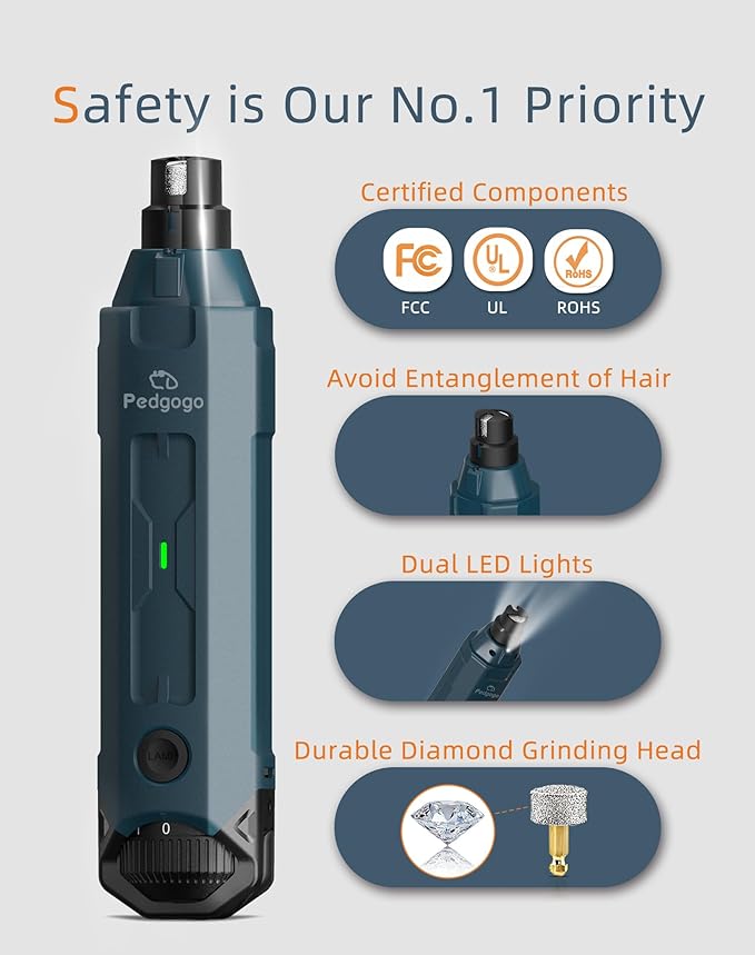 - Safety Guarantee: Equipped with 2 LED lights, the dog nail clipper provides clear visibility on your dogs’ quick, preventing over-clipping and ensuring your dog's safety. The included safety cap helps avoid entanglement of the hair when grinding. Pedgogo dog nail trimmer also comes with FCC and UL certifications and is crafted from environmentally friendly ABS plastic for added peace of mind