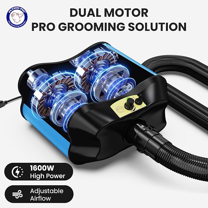 - Dual Motor & Adjustable Airflow -Provides powerful and stable airflow to help you with those furriest and thick coated friends. The dual motor provides stronger airflow than many dryers. Watts: 1600/Volts: 120V