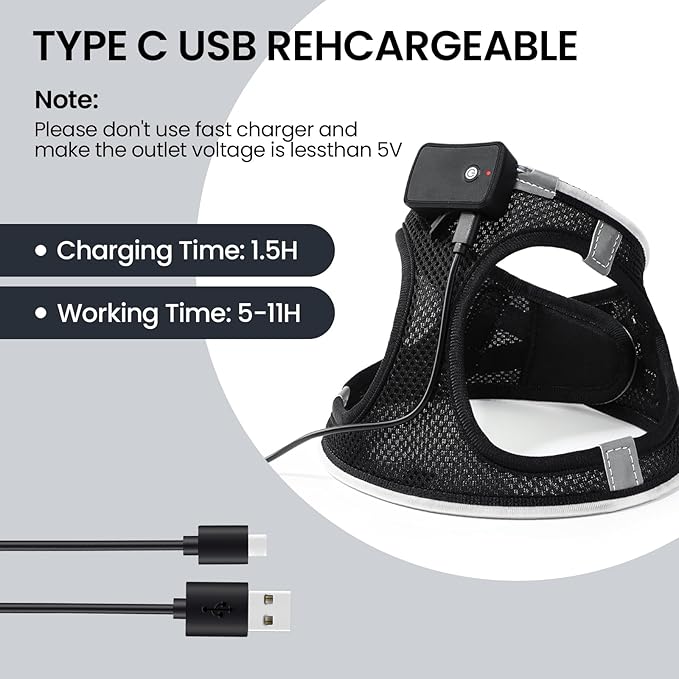 - USB Rechargeable: The LED dog harness is easy to charge using a USB cable. With a large battery capacity, it can last up to 5-11 hours on a single charge, making it perfect for long walks, hikes, and other outdoor activities.