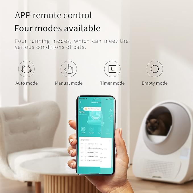 - ๐ฐ ๐๐น๐ฒ๐ฎ๐ป ๐ ๐ผ๐ฑ๐ฒ๐: Auto Mode, Manual Mode, Timer Mode, and Empty Mode are available with remote app control or panel control. In addition, the empty mode is convenient for changing all cat litter and cleaning the globe.