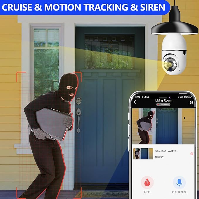 - 【Motion Detection】This light bulb camera features advanced motion detection and motion tracking alerts, never miss a moment. Whenever any suspicious activity is detected, you will receive instant notifications on your smartphone so you can take immediate action.