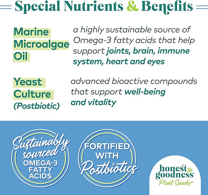 - SPECIAL NUTRIENTS – Our snacks are also infused with Marine Microalgae Oil, a highly sustainable source of Omega 3s, and Yeast Culture (Postbiotic), which contains advanced bioactive compounds that support well-being and vitality.