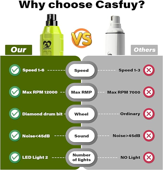- Newest enhanced power & 6 precisely controlled speeds: 7000RPM to 12000 RPM power makes Casfuy dog nail grinder one of the most powerful grinders on the market. It is also the safe power to grind at home. Multiple speeds and ample power meet small, medium, and large pets' nail trimming needs.