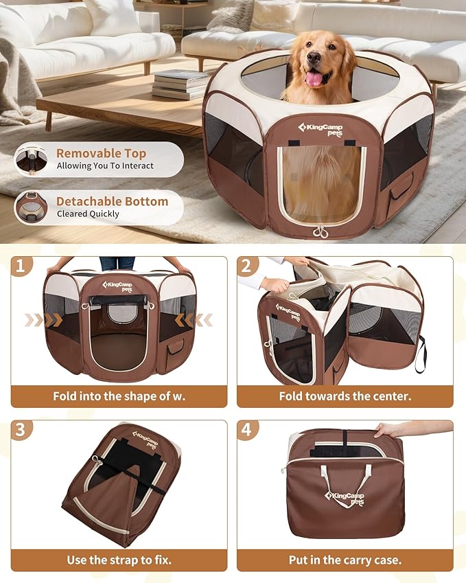 KingCamp Dog Playpen, Portable Foldable Cat Kitten Puppy Tent Crates 29"/36"/50" Pop Up Pet Playpen with Zippered Bottom & Cover for Indoor Outdoor Use (Small, Khaki)