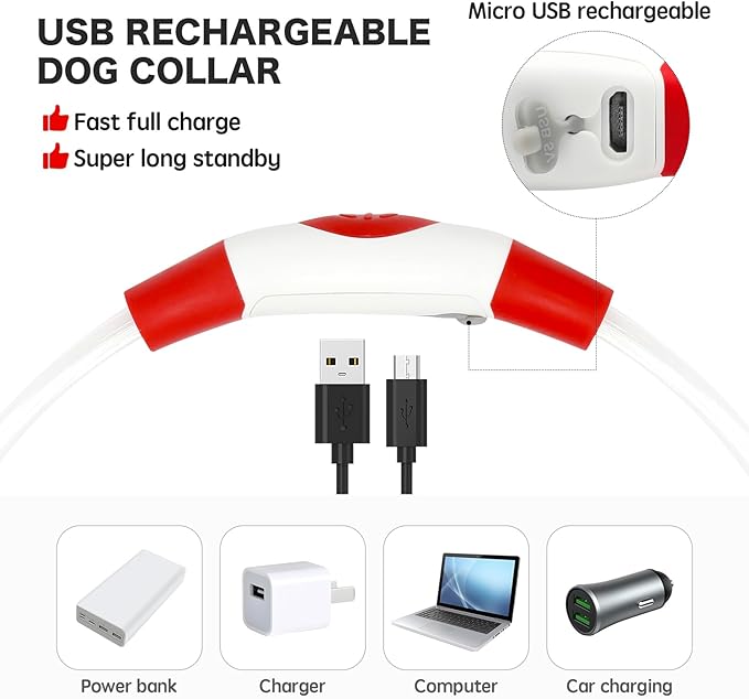 - ★Efficient and Convenient Lighting for Your Pet with the Rechargeable LED Dog Collar: The LED Dog Collar features multiple flash modes, including steady glow, quick flash, slow flash, and off, offering versatile use. The collar light is conveniently recharged with a mini USB cable after use, making it an energy-saving and convenient option for your pet's nighttime adventures.