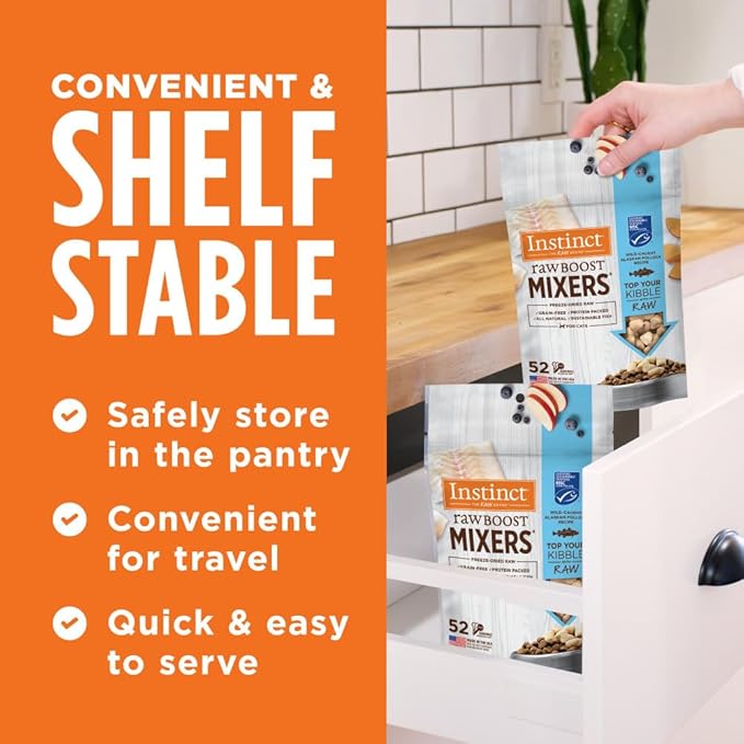 - FREEZE DRIED RAW CAT FOOD TOPPER WITH WILD-CAUGHT ALASKAN POLLOCK: Add raw to your cat bowl with Instinct Raw Boost Mixers all natural, grain free cat food toppers. Made with responsibly sourced wild-caught alaskan pollock and non-GMO vegetables & fruits.