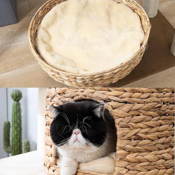 - Unique High-end Design. This cat furniture has a novel and unique design, with two cat sleeping baskets and a semi enclosed cat cage, both made of water hyacinth grass. Paired with three replaceable and machine washable cushions (you can switch to any style or color you want by yourself). This large cat tree can provide a place for at least three adult cats to rest and nap, making it perfect for cat owners with multiple cats in their home.