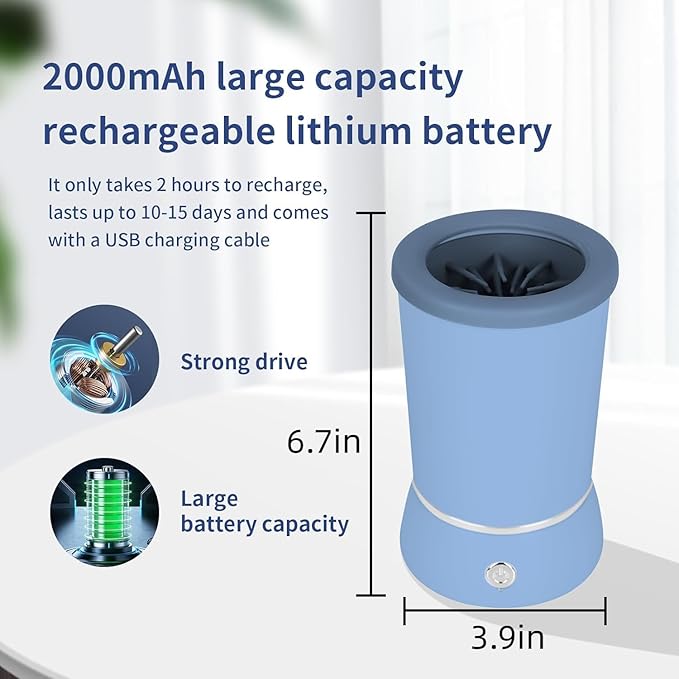 - [Easy to clean and durable] automatic paw washer, easy to disassemble and clean. Just remove the top cover, remove the silicone brush pad, and wash with water. Built-in 2000mAh large-capacity rechargeable lithium battery, full charge only takes 2 hours, battery life up to 7-10 days, and is equipped with type-c charging cable