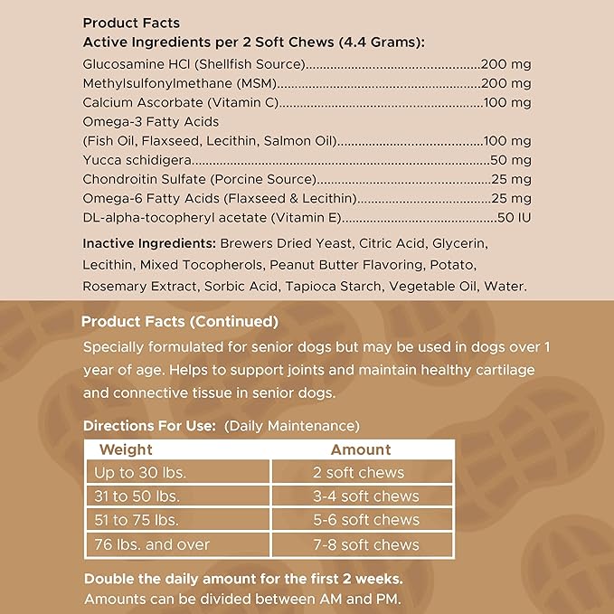 Glucosamine for Dogs Hip and Joint Supplement - 120 Soft Chews for Senior Dogs with Glucosamine, Chondroitin, MSM, and Omegas - for Mobility, Cartilage, and Joint Health - Peanut Butter Flavor