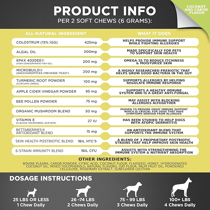 - NEW AND IMPROVED FORMULA: Our new formula Allergy & Immune support chews with omega 3 for dogs provides allergy relief for dogs itching and support a natural histamine response. Meaning less itching, sneezing, and scratching for your pup.