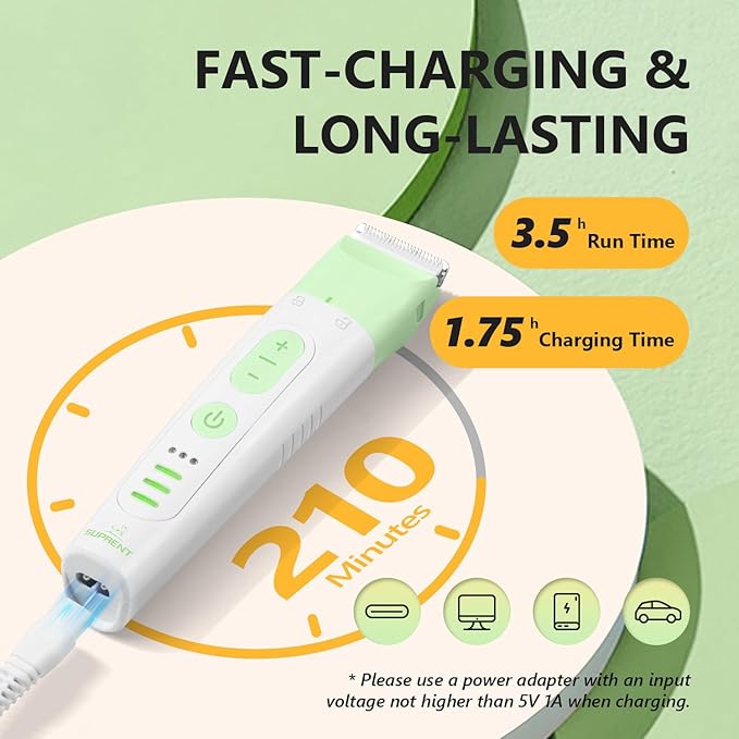 - 【PERFECT FOR BEGINNERS】SUPRENT professional dog grooming clippers offer 3 adjustable speeds (5500/6500/7500RPM), allowing you to tailor the trimming experience to your pet's noise tolerance and hair thickness. Equipped with 2 attachment guide combs (3/4&5/6mm) for the hair clipper and one guide comb (2mm) for the paw trimmer, you have full control to customize and adjust the length of your pet's hair with ease.