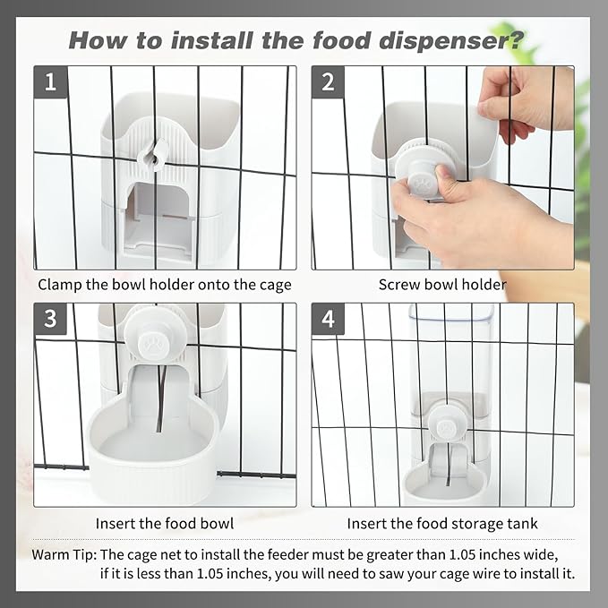 - Easy to install: The automatic pet food feeder can be placed on the ground or hung in a cage; Just attach the swivel buckle to the cage and you can hang it securely on the cage; Note: The cage net to install the feeder must be greater than 1.05 inches wide, if it is less than 1.05 inches, you will need to saw your cage wire to install it