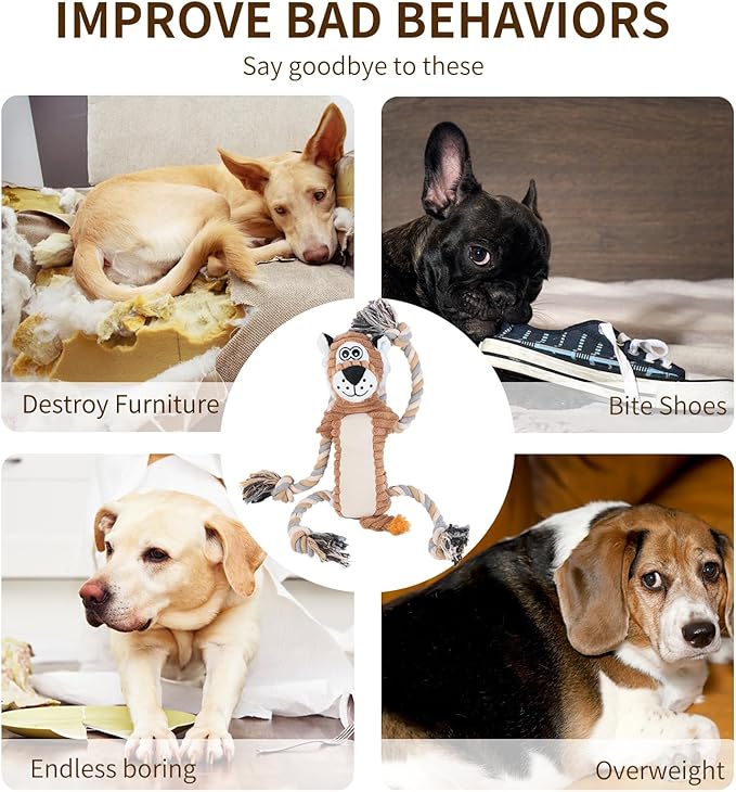 - PLUSH CUTE SQUEAKY DOG TOYS:Engage your pup with our adorable plush lion dog toys, featuring a crinkle paper sound and hidden squeaker for double the fun. Soft, pp-cotton-blend plush ensures safe play for small & medium breeds. Durable cotton-rope legs withstand bites and hugs, making this toy a cozy companion for pets.
