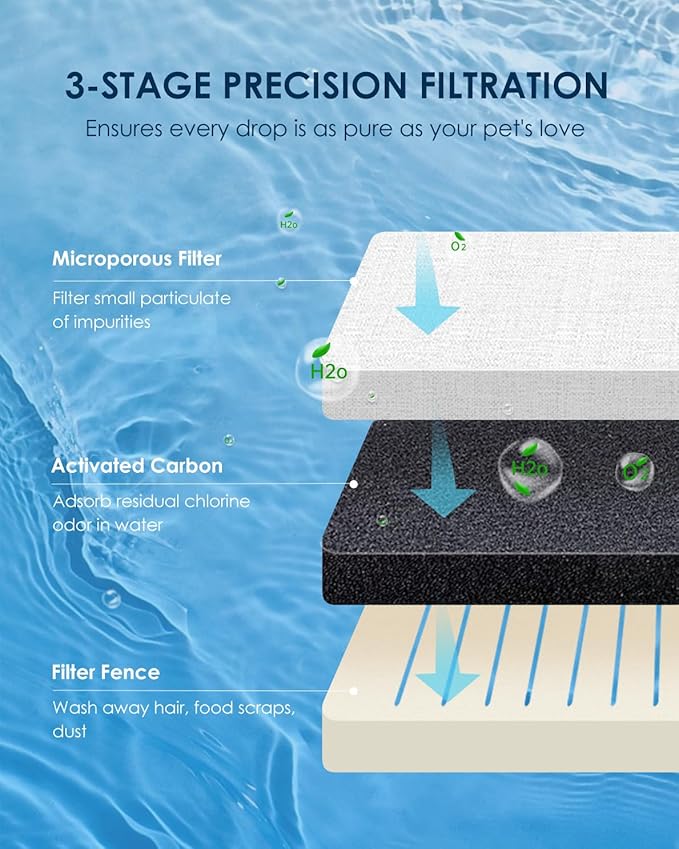 - ๐ฏ-๐๐ฎ๐๐ฒ๐ฟ ๐๐ถ๐น๐๐ฟ๐ฎ๐๐ถ๐ผ๐ป - ๐ฃ๐๐ฟ๐ฒ ๐ช๐ฎ๐๐ฒ๐ฟ ๐๐ป๐๐๐ต๐ฒ๐ฟ๐ฒ! This gravity water bowl for cats includes Includes 1 premium filter with: (1) Microfiltration Cotton (traps debris), (2) Activated Carbon (eliminates odors), (3) Filter Barrier (blocks hair). It provides pets with pure and healthy drinking water.