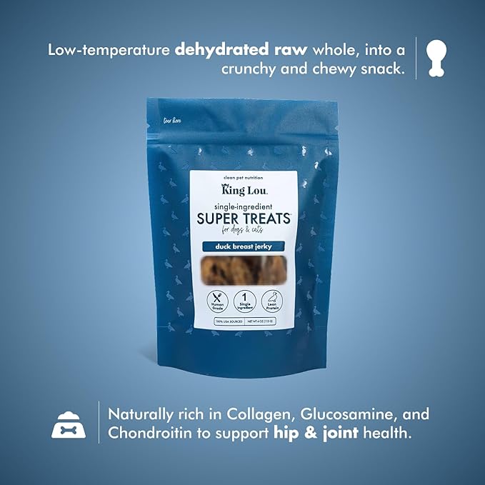 - King Lou Dog Treats, For Cats Too! - Our duck jerky for dogs and cats are specifically formulated to give fur parents premium options. Each box is only made with whole food, human-grade Ingredients.