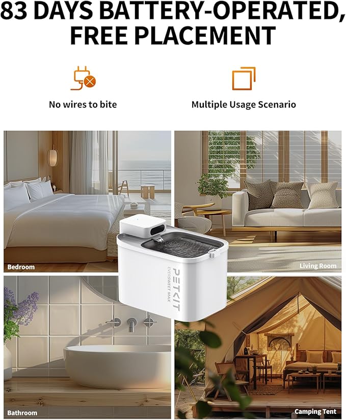 - Wireless Cat Drinking Fountain: PETKIT new upgraded wireless water dispenser, no need to plug in, you can place it anywhere: kitchen, bedroom, balcony, etc., bring you a new feeling; 5000mAh high-capacity battery, service life up to 83 days! No more worry about your cat or dog running out of water during power outages or short trips!