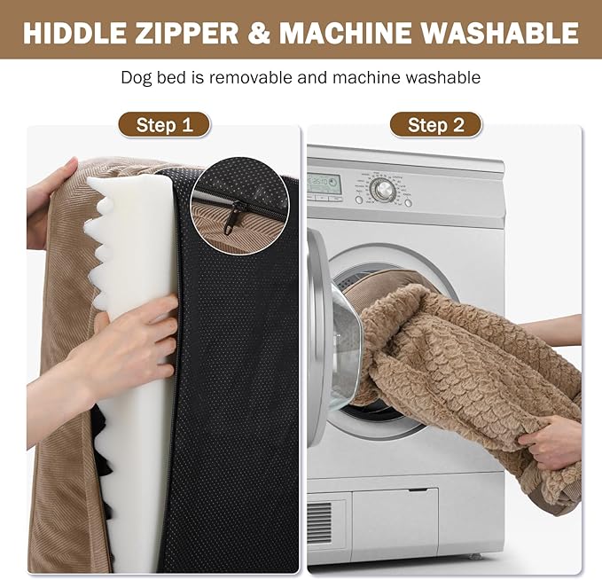 • 🐶WATERPROOF & WASHABLE DOG BED: The dog bed features a removable, machine-washable cover with a zipper for easy to quick remove and care, so just throw it in the washing machine and will be as good as new, ensuring your pet's space stays fresh and hygienic. The waterproof inner lining fully protect the foam from spills, water damage, or accidents, prolonging the product's life.