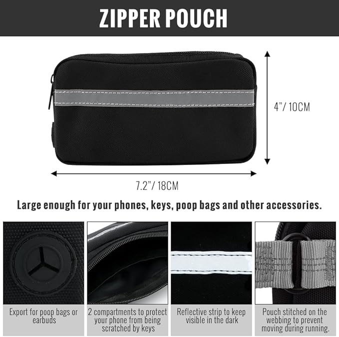- 【Immovable Large Zipper Pouch】The walking dog leash comes with a large zipper pouch. The pouch is 7.2”*4”*1.2” in size, large enough to store most cellphones, keys, poop bags and other accessories. The pouch has 2 compartments to protect your phone from being scratched by keys. Unlike other running dog leashes that the pouch moves everywhere during running, our pouch is stitched to the waist belt so that it can stay still.