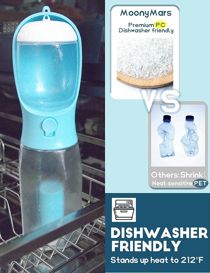 - Dishwasher friendly: crafted from food-grade ABS+PC, BPA-free, our dog water bottle withstands 212 ℉/100 ℃, dishwasher-friendly. Perfect for dog walks, travel & trips, picnics, camping, hikes, or any pet-parenting adventure