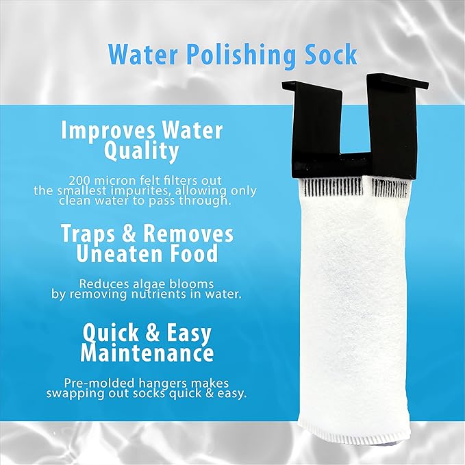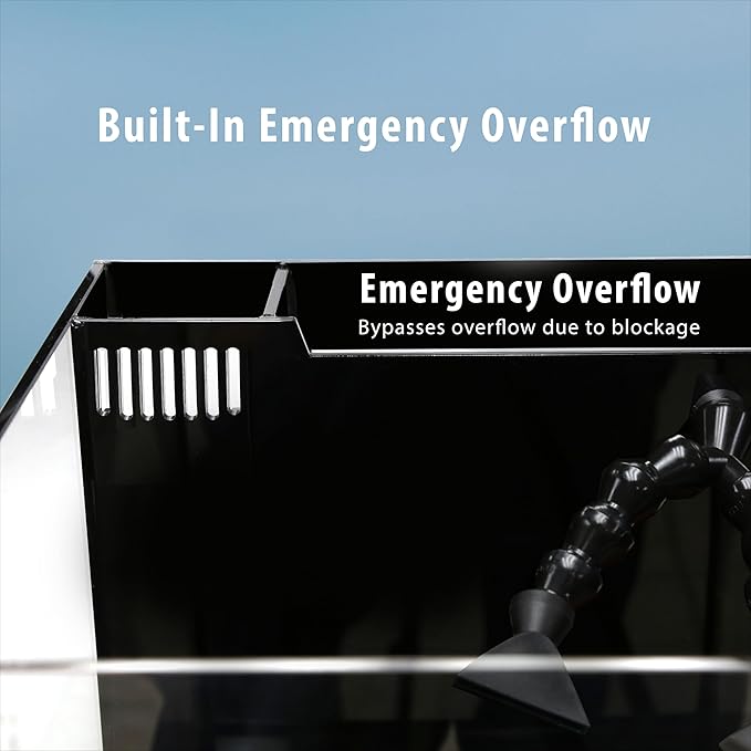 - Filtration: Built-in Acrylic Overflow Wall | Integrated Emergency Overflow | (2) - Removable 200 Micron Filter Sock (2) - Adjustable 130 GPH DC Return Pump 5W/24V | Includes: Flexible hose, Return Elbow and Directional Flow Nozzle