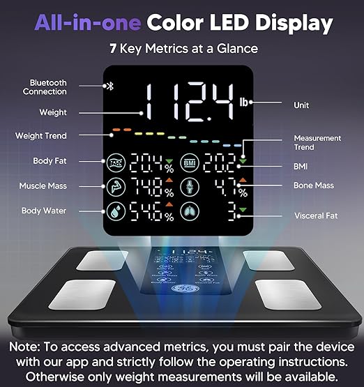 - 7 METRICS SHOWS ON DISPLAY: The weight scale with body fat and muscle mass is equipped with an HD LED display, showing 7 key metrics including weight, BMI, body fat, body water, muscle mass, bone mass, and visceral fat. Once the Fit Profile app is downloaded and the initial setup is completed, these metrics can be viewed directly on the scale's display, eliminating the need to open the app each time. It makes health monitoring easy and convenient, great for personal or gym use