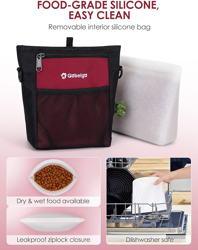 - 2 in 1 Design: A food grade silicone bag is provided; it fits perfectly inside the dog treat bag. A perfect way to hold meat or messy treats and ensure bag inside remains clean. Treats stay fresh because of tight seal. Silicone bag is dishwasher safe