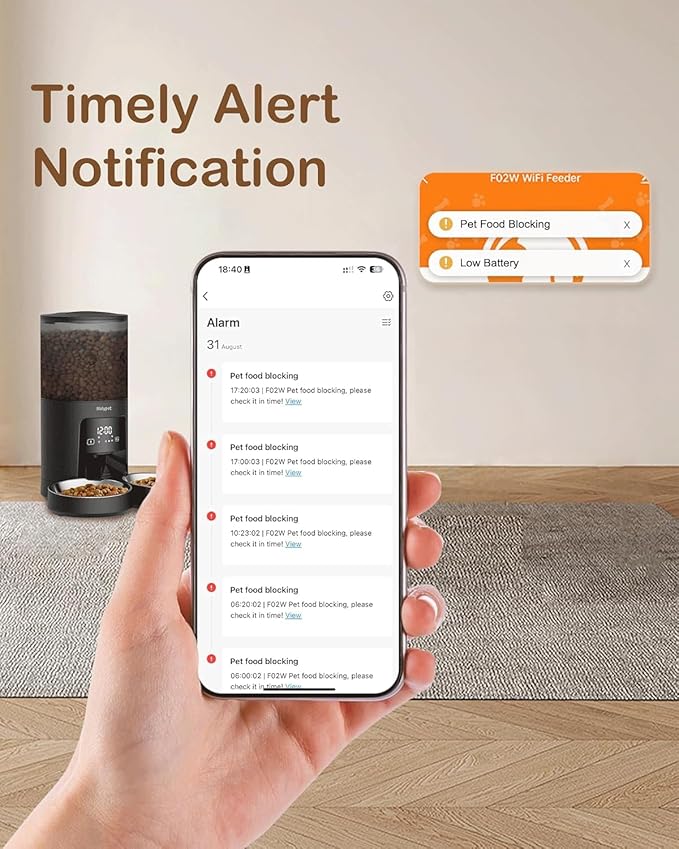 - Smart Alarm Notification: When the wifi cat feeder is blocked, short of food, empty of food or low battery, you will receive an alarm on your APP in time.The infrared sensor keeps checking and stops food dispensing if the food outlet is blocked