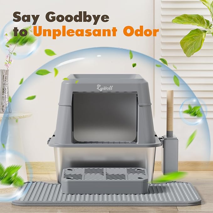 - 😽[One-Stop Solutions] This stainless steel cat litter box enclosure comes with a cat litter mat and a cat litter scoop with holder, one purchase for all litter cleaning needs. As the last barrier, cat litter mat can effectively collect the litter carried by cat paws. The cat litter scoop that hangs off the side of the box, concealing the messy scoop yet keeping it within easy reach. The cat litter scoop is compatible with all types of cat litter, wooden handle is easier to use.