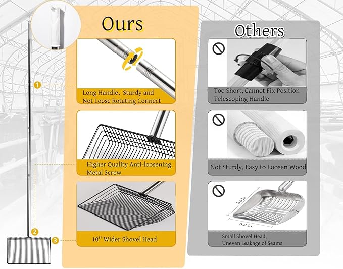 - Efficient Sifting and Cleaning: The innovative hollow design at the base of this metal litter scoop allows for fast sifting, separating chicken poop from other debris with ease. Made of non - stick stainless steel, it functions as a top - notch stainless steel litter scoop. Cleaning is a breeze; simply rinse it with water, and it's ready for the next use. It can be used as a poop scoop for various waste - removal tasks around the yard, including picking up dog poop