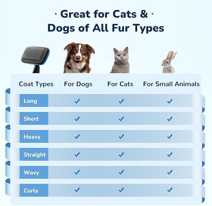 - SUITABLE FOR ALL COAT TYPES : The dog brush for shedding is suitable for use on dogs, cats, and small animals with all coat types, including long, short, curly, wiry, and even heavy coats.