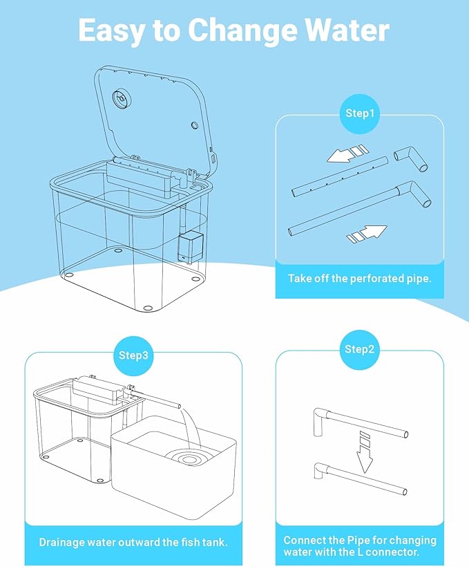 - 【Easy to Change Water】We equip a long pipe for changing water: take off the perforated pipe, then connect the long pipe for changing water with the L connector, easily drainage water outward the fish tank.