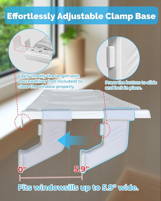 - Heavy-Duty Adjustable Clamp Base: Our cat window bed features a button-press adjustable base, easily sliding into place and locking securely for a perfect fit on windowsills up to 5.9 inches wide. This versatile design adapts to most window types, making it a great option for your cat ledge for window sill.