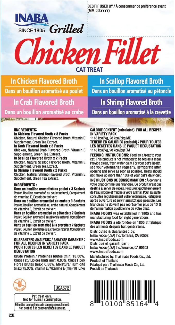 INABA Premium Grilled Chicken Fillet Cat Treats with Vitamin E and Green Tea Extract, 0.9 Ounces Each, Pack of 10, Variety Box