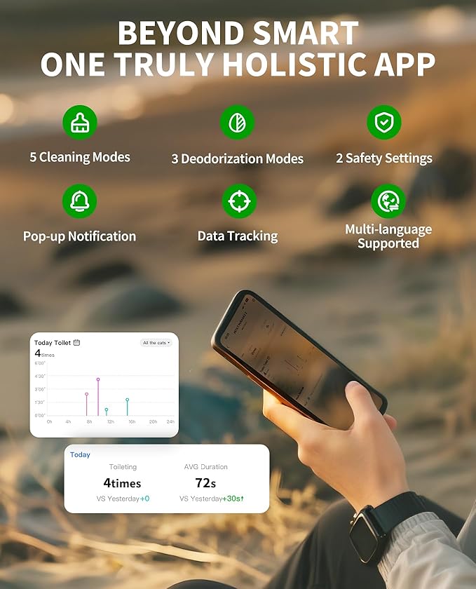 - 100% Safe for Cats: With several safety mechanisms as well as excellent smart sensors, the xSecure system offers your cat a safe potty experience. It consists of infrared sensor, weight sensors, remote alerts, an accident protection system, and smart detection to keep your cats safe. In addition, It automatically pauses when your cat approaches or detects a weight change. Warm Tips: Applicable weight range for cats: 1.5kg to 8kg, do not use for young pets under 6 months.