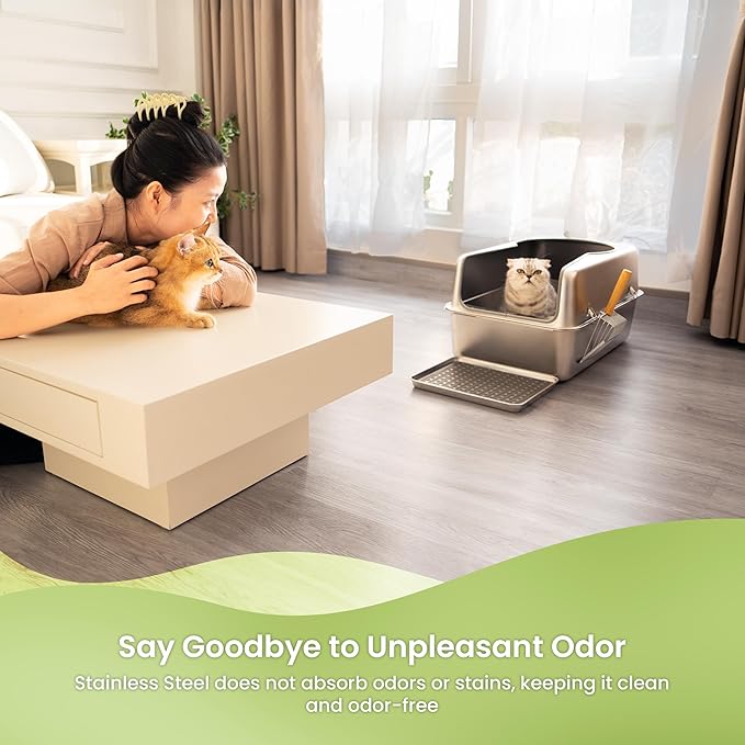 - Odor-Free Large Litter Box: The smooth surface of stainless steel doesn't absorb odors, maintaining a fresh environment even after prolonged use. Additionally, Cattasaurus stainless steel sifting litter box is easy to clean, simplifying maintenance.