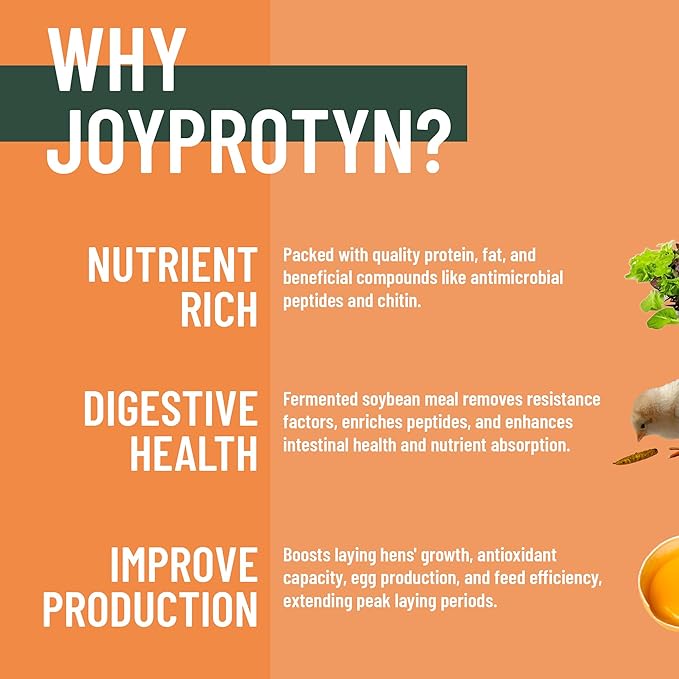- Worry-Free After-Sales Service: At Joyprotyn, your satisfaction is our priority. Each 10LB bag provides ample supply for your flock, and if you’re not fully satisfied with our premium BSFL feed, our dedicated customer service team is here to ensure a solution. Enjoy peace of mind with Joyprotyn’s high-quality, nutritious feed for worry-free feeding.
