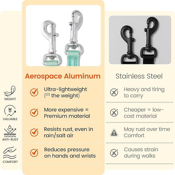 - 【Nylon & Aviation Aluminum】✨ : Crafted from 100% durable nylon, this leash is strong and comfortable for both pets and owners. The leash also features lightweight aviation aluminum hooks that reduce weight by over 40%. These strong, practical hooks not only enhance the leash’s sleek appearance but also keep it tangle-free.
