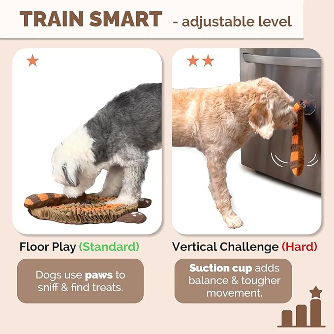 - VERSATILE & FUNCTIONAL - The unique animal pattern design of our snuffle mat features a detachable tail and legs as additional interactive dog toys, offering multiple hidden pockets, crinkles and squeakers to provide extra dog enrichment exercises.