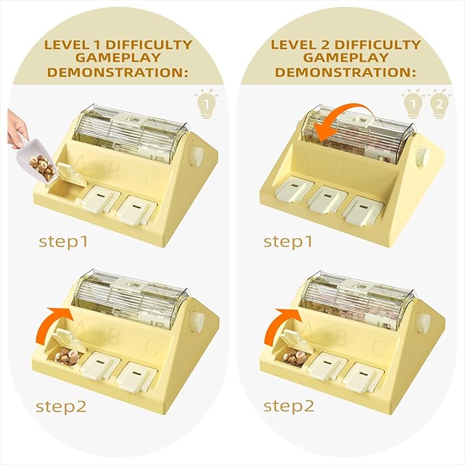 - [Two Difficulty Levels for Progressive Play] This interactive puzzle toy offers two difficulty levels—Level 1 and Level 2. In Level 1, your dog can open 6 food boxes to access treats, while in Level 2, they rotate the central food cylinder to dispense food into the boxes. This progressive challenge helps keep your dog engaged and promotes problem-solving skills. The adjustable design ensures that the toy grows with your dog’s intelligence, offering an evolving experience that encourages learning and play while rewarding them with food.