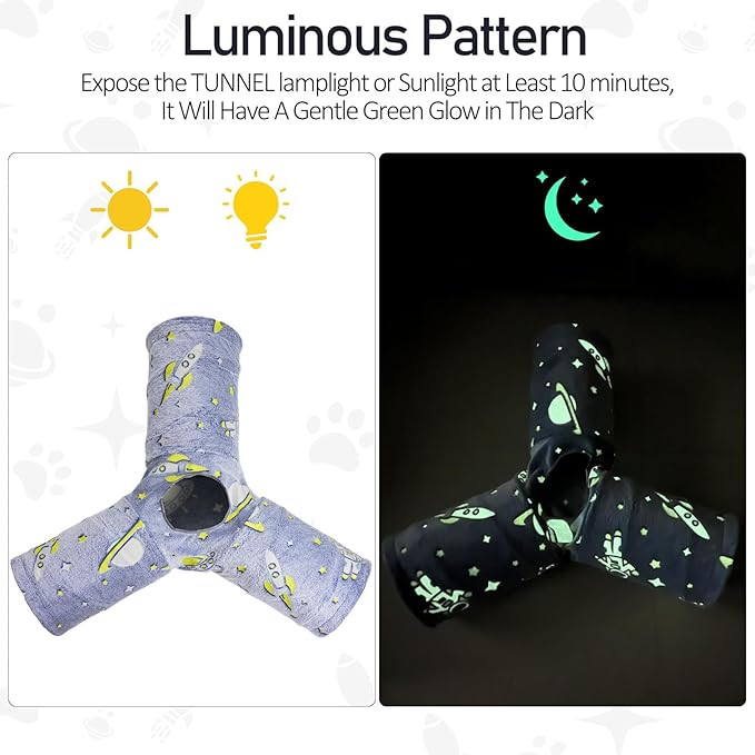 - 【New Upgrades】This Y style Cat Indoor Play Tunnel is new upgrade, cat tunnel with Cute Luminous Pattens. After expose the 3 way collapsible cat tunnel toy lamplight or sunlight at least 10 minutes, these pattens will have a gentle green glow in the dark. Brings new fun to pet play in the dark.