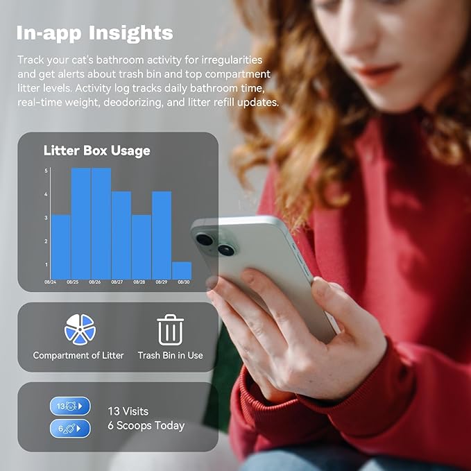 - CONTROL FROM YOUR PHONE WITH 5G WIFI: Stay connected to your cat’s health anywhere with lalahome app. Compatible with both 5G and 2.4G WiFi, it gives you real-time updates on your cat's weight, litter box usage and more. Receive instant alerts when the waste drawer is full or cat litter is running low. Customize refill frequency and cleaning schedules to suit your cat’s habits. (Custom mode in operating mode)