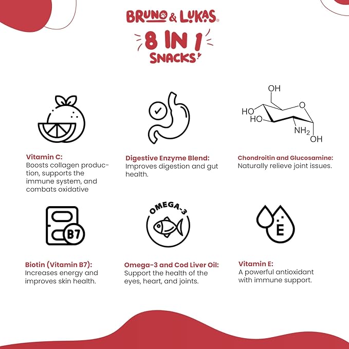 - 8-IN-1 MULTIVITAMIN TREATS FOR DOGS – COMPLETE DAILY WELLNESS: These Multivitamin Treats for Dogs are packed with 8 essential benefits in one daily chew, offering powerful support for joints, digestion, immune function, skin, and coat health. Designed as a comprehensive dog supplement, this formula helps improve energy, vitality, and overall well-being in dogs of all ages and breeds.