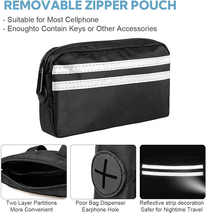 - Multifunctional Dog Walking Bag: This dog walking fanny pack can be used as a dog treat pouch, which has perfect size, the treat pouches is super nice to put dog treats in it for pet training! There is a small hole on the side of the bag, which can be used as a dog poop bag holder for leash and can also be used to connect headphone cables while running.Get ready to have the best time with your dog with the attached bag in a dog running leash hands free! Enjoy a hands-free walk, run experience with your furry friend
