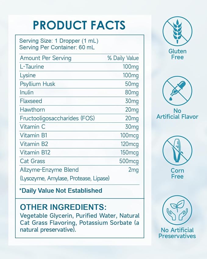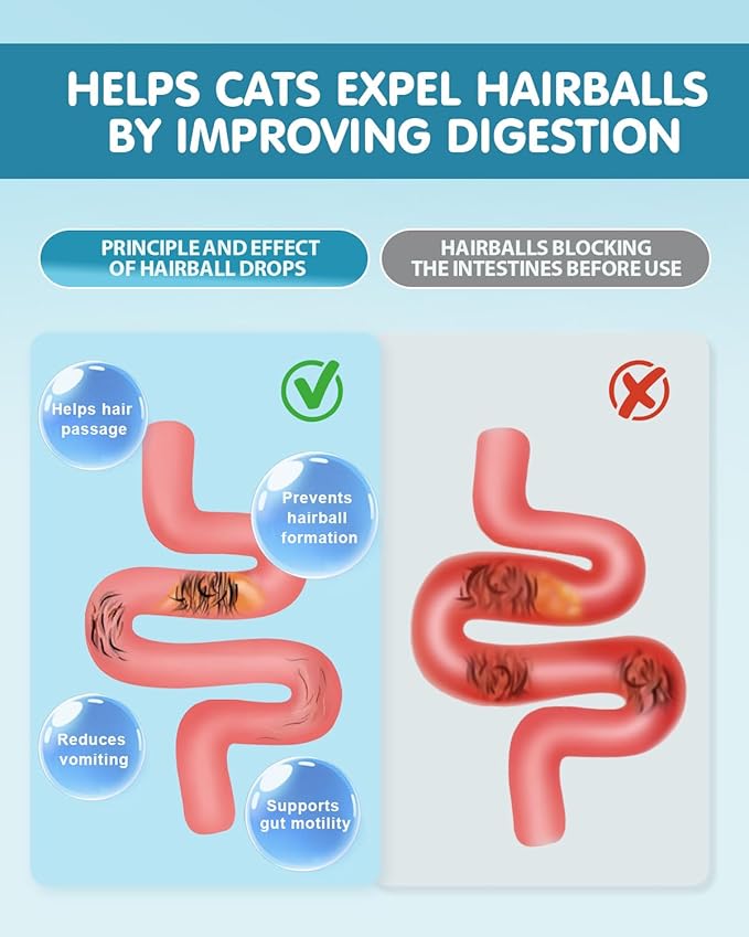 - 【Precise & Low-Calorie】Unlike high-calorie pastes or messy gels that get everywhere and are hard to measure, this liquid hairball relief supplement gives you precise dosage control while avoiding extra calories. Great for cats on weight control, and for pet parents who want a cleaner, simpler solution to hairballs.