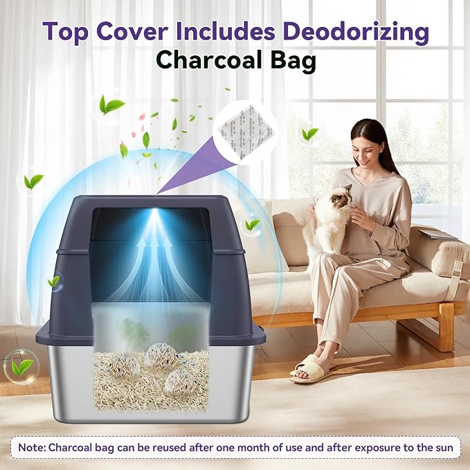 - 【Clean and Fresh】This sifting litter box is equipped with a stainless steel pan, which has a smooth surface that is easy to clean and wipe down, and odors will not adhere to it, always keeping the air fresh. The top lid also has an activated charcoal bag to better absorb odors and make you and your cat get along better!