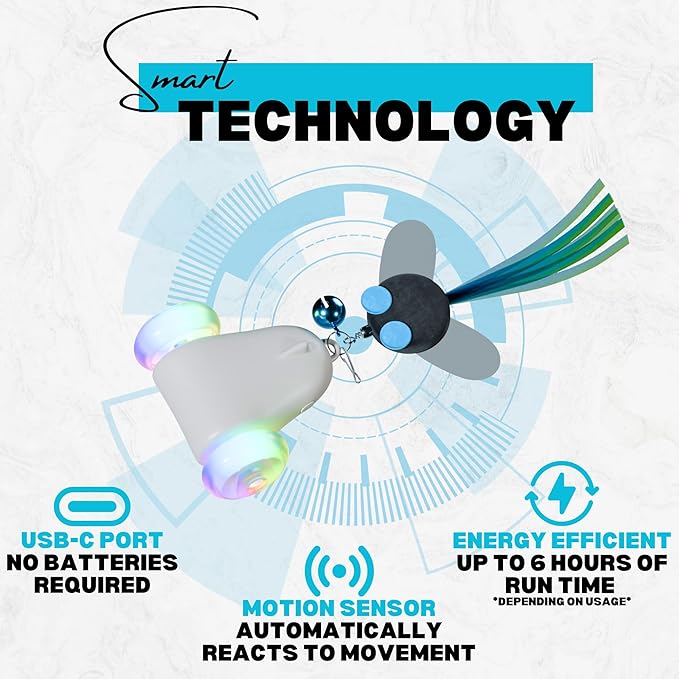 - USB-C Rechargeable: Featuring convenient USB-C charging, this electronic cat toy ensures it's always ready for action without the hassle of replacing batteries. Enjoy up to 6 hours of run-time (depending on usage), keeping your cat entertained all day long