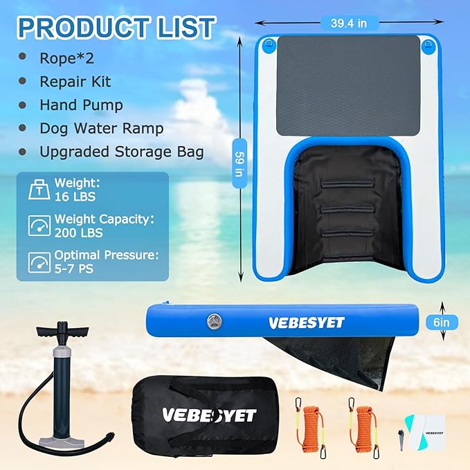 - 【Super Stable Design】The inflatable dog floating ramp utilizes drop stitch technology for a flat, sturdy surface when inflated. Built-in EVA leash pads are non-slip; stainless steel D-rings ensure optimal stability and allow it to be secured to the side of the boat, outside of the boat or poolside.